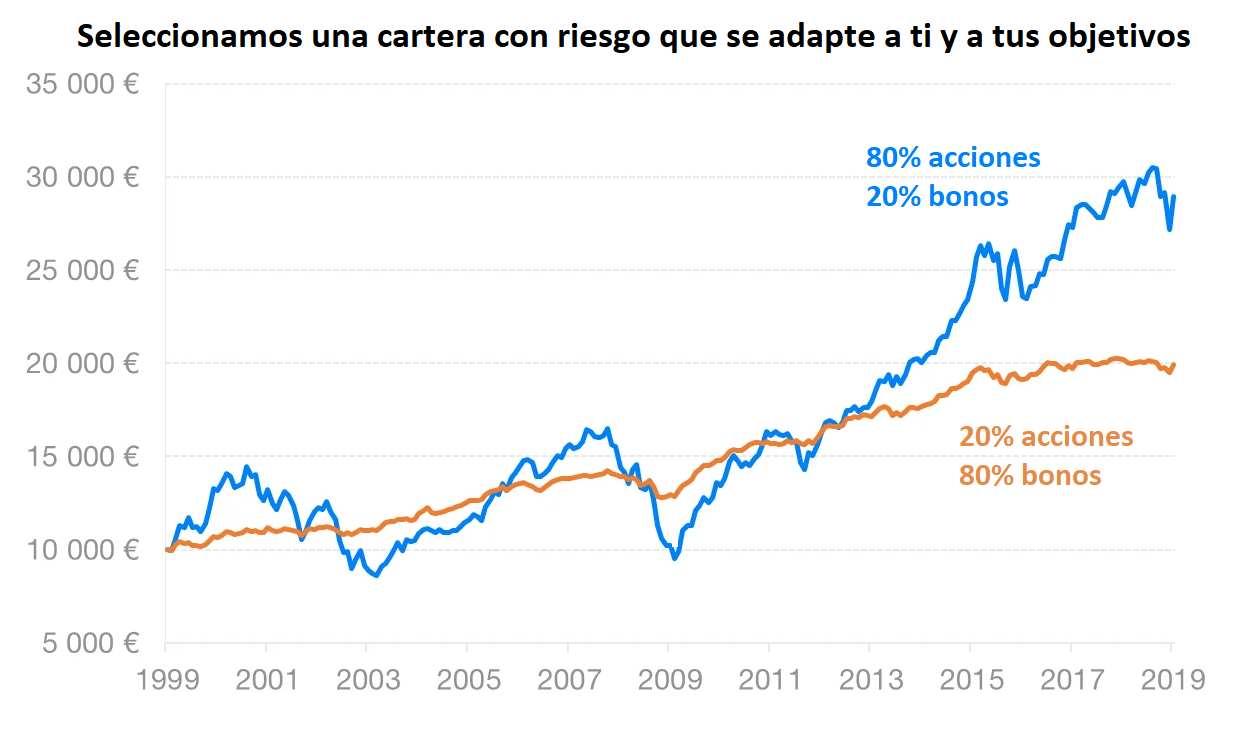 La composición de tu inversión se adaptará a tus necesidades y capacidades. Si no te gusta la alta volatilidad de las acciones, invertirás más en bonos que en acciones. Construiremos tu portafolio en función de: